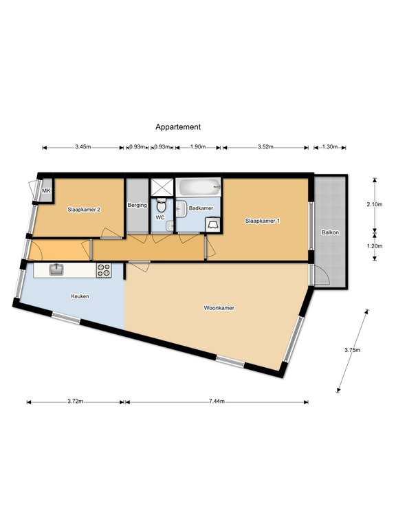 Appartement: Entree met hal, intercominstallatie, ruime bergkast en modern separaat toilet met fonteintje. Speelse woonkamer met deur naar zonnig balkon. Door de ligging op de hoek zijn er 2 zijramen waardoor er veel lichtinval is. Prima keuken welke met losse apparatuur aangevuld kan worden. Het appartement telt 2 ruime slaapkamers. Moderne en vernieuwde badkamer met douche, wastafel en wasmachineaansluiting.