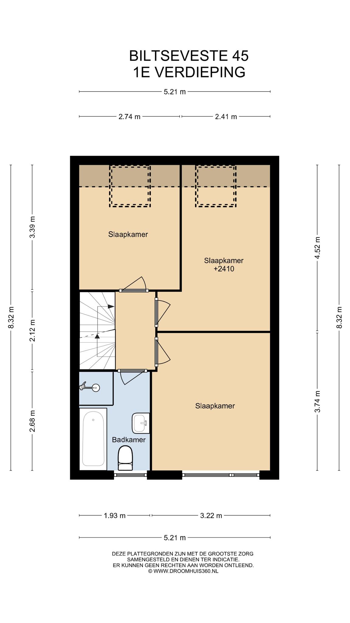 1e verdieping: de overloop geeft toegang tot de 3 ruim bemeten slaapkamers en de keurige badkamer met ligbad, douchecabine, wastafel en 2e toilet.