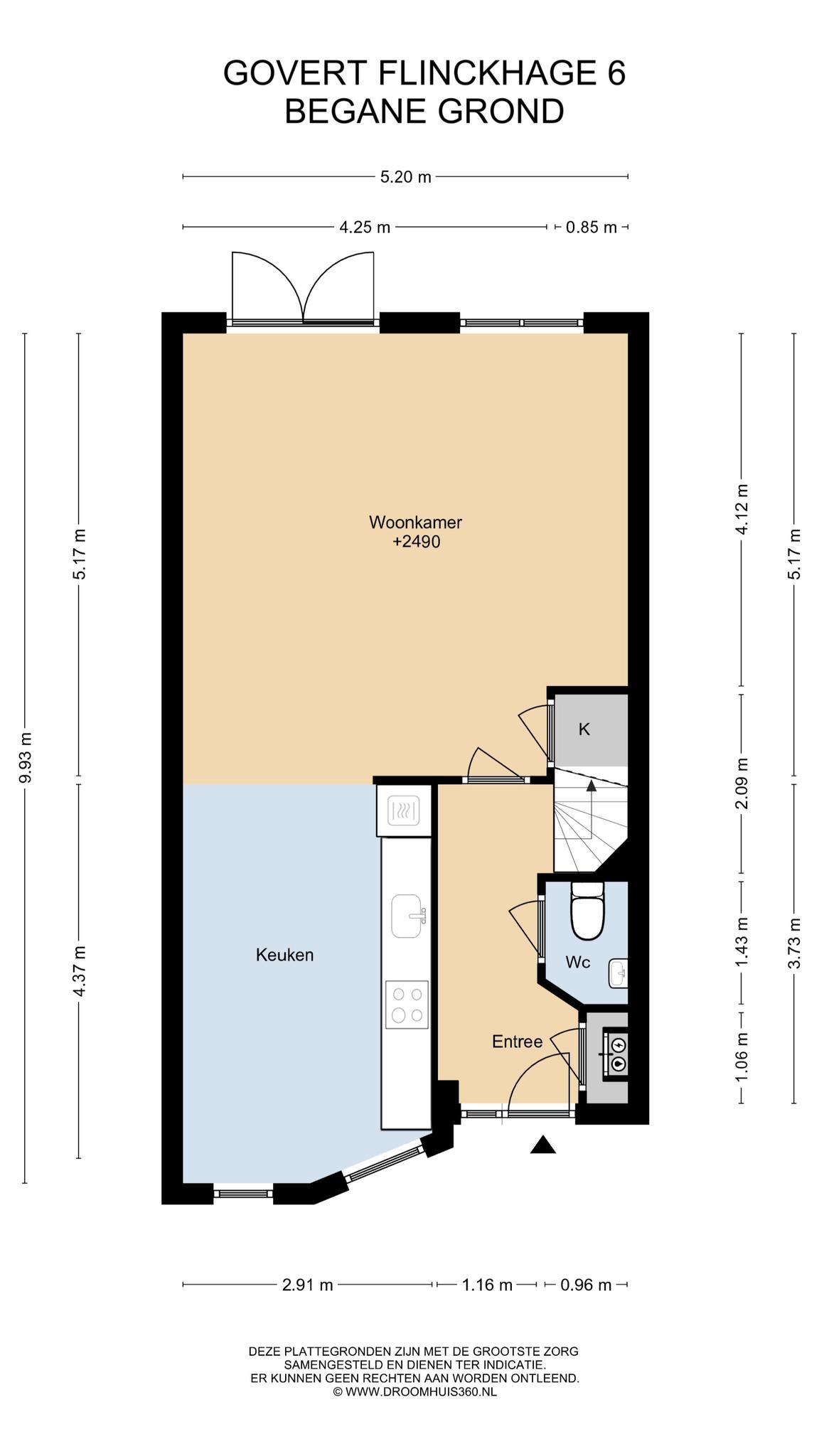 Begane grond: ruime entree/hal met meterkast en toilet, de woonkamer is tuingericht en heeft een trapkast, openslaande deuren geven toegang tot de tuin. De half open keuken is aan de voorzijde gesitueerd en is voorzien van een keukeninrichting met diverse inbouwapparatuur: keramische kookplaat, koelkast, vaatwasser, afzuigkap en magnetron/oven.