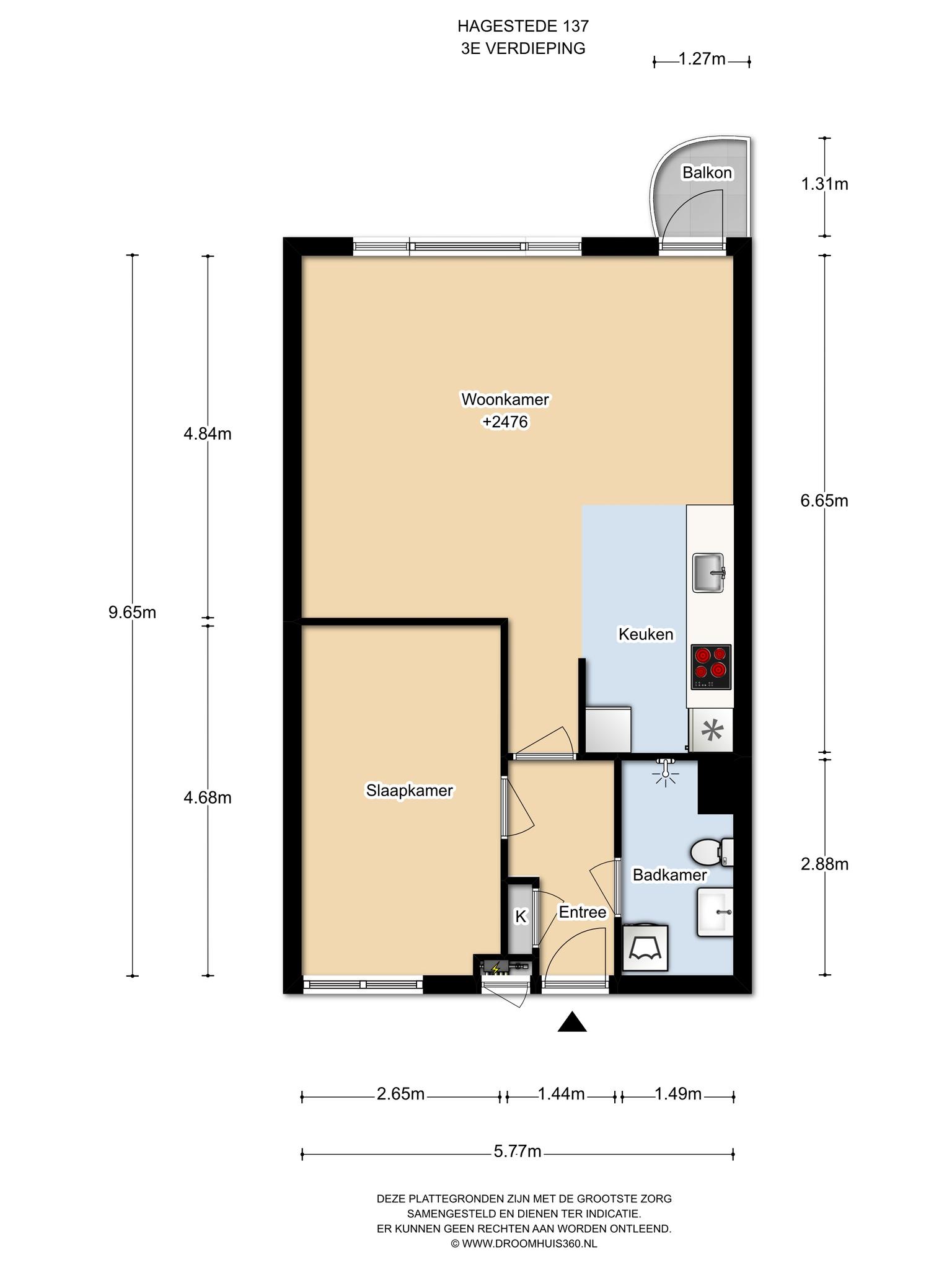 Appartement: Entree, hal, toegang tot woonkamer. De ruime woonkamer en open keuken zijn onderdeel van het woonoppervlakte van maar liefst 56m2. De open keuken is voorzien een keukenblok welke van alle gemakken is voorzien. Vanuit de woonkamer is er toegang tot het kleine balkon. Door het grote raam is de woonkamer voorzien van veel lichtinval. De slaapkamer is gelegen aan galerij-zijde van het appartement en ca. 12 m² groot. De badkamer is netjes uitgevoerd en voorzien van een toilet, wastafel en een douche.