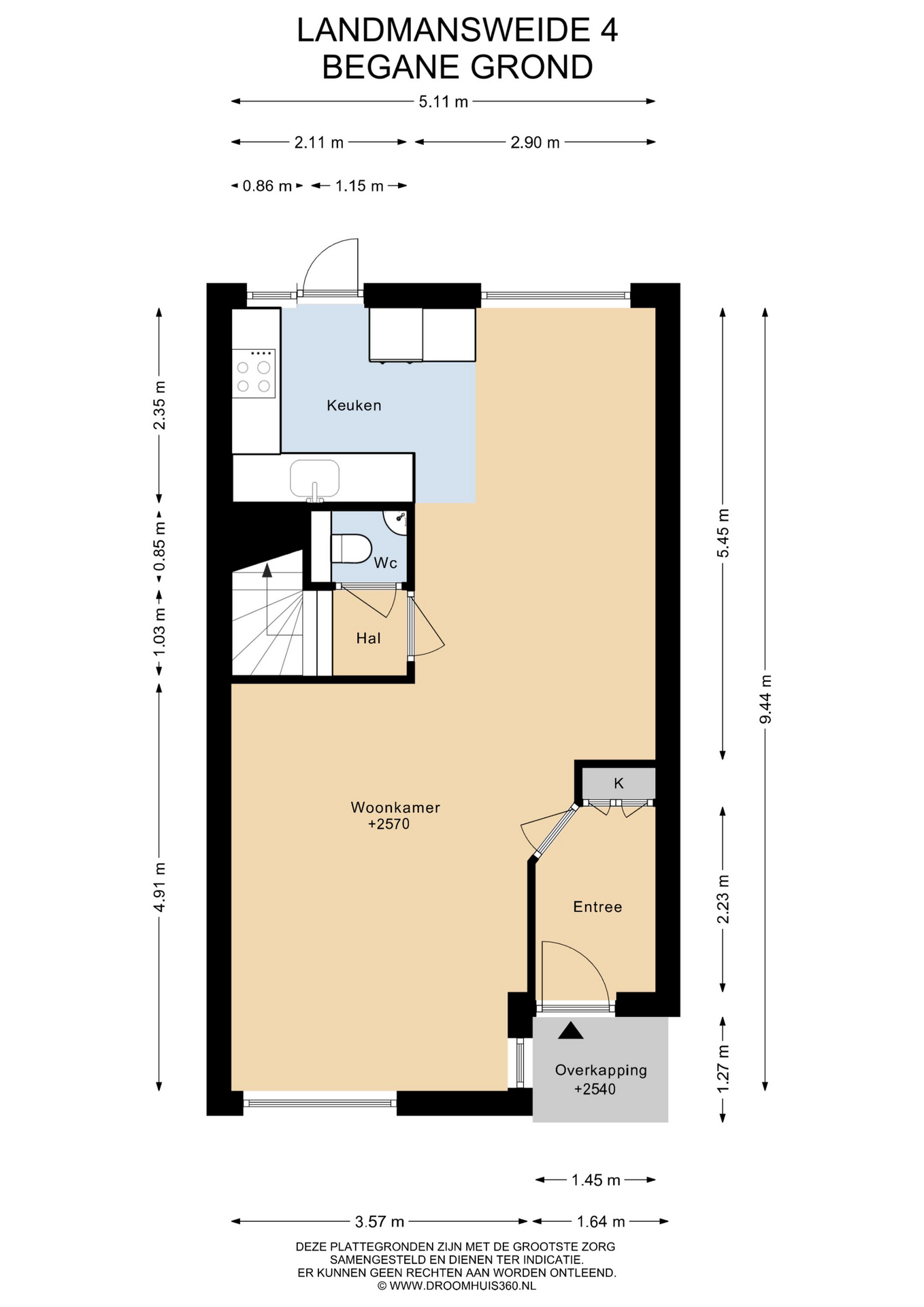 Begane grond: entree/hal met meterkast, ruime en gezellige woonkamer met eethoek aan de achterzijde. Deze sluit aan op de half open keuken waardoor het gevoel van een eetkeuken is ontstaan. De moderne keukeninrichting heeft een hoekopstelling met een extra blok. De inbouwapparatuur bestaat uit een inductiekookplaat, koelkast, vriezer, magnetron/oven, afzuigkap en vaatwasser. Een 2e hal met modern toilet en trapopgang.