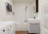 Via de hal wordt eveneens toegang verschaft tot een 2-tal royale slaapkamers. Daarnaast vindt u in de hal een toiletruimte met fonteintje. Keurig uitgevoerde badkamer welke is voorzien van ligbad en vaste wastafel met meubel. In het appartement ligt een mooie laminaatvloer.