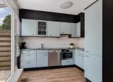 De lichte en ruime keuken heeft een kunststof werkblad met een RVS spoelbak en diverse inbouwapparatuur, zoals: 4-pits keramische kookplaat (Miele), vlakscherm afzuigkap, koel/vries combinatie (Indesit), combi-oven (Bosch) en vaatwasser (Siemens). Verder is de keuken voorzien van voldoende bergruimte. Vanuit de keuken is de tuin toegankelijk middels openslaande deuren.
