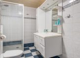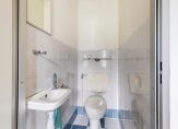 De geheel betegelde badkamer is voorzien van een douchecabine, toilet, radiator en een wastafelmeubel met spiegel.
