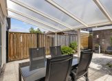 De sfeervolle achtertuin ligt op het oosten en heeft diverse borders met bloemen en planten, sierbestrating, houten schutting, aluminium overkapping, verlichting en een houten berging (met elektra) en achterom.