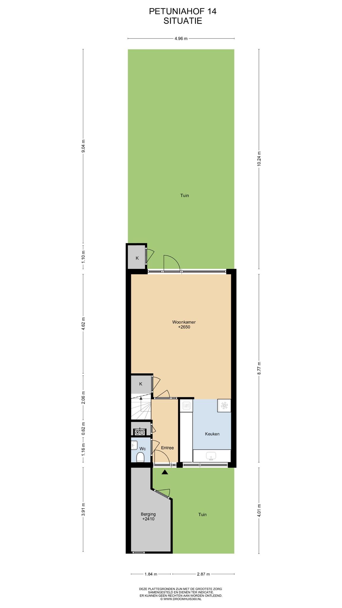 Begane grond: entree/hal met meterkast en toilet. De woonkamer is tuingericht en geeft via een deur toegang tot de achtergelegen tuin. De halfopen keuken bevindt zich aan de voorzijde en is voorzien van een eenvoudige keukeninrichting in hoekopstelling met 4-pits gas, afzuigkap, vaatwasser en oven.
