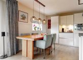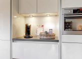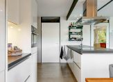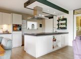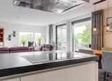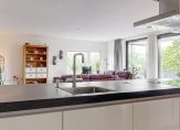 De moderne en open inbouwkeuken heeft de beschikking over een eiland en diverse inbouwapparatuur, te weten: vaatwasser, combimagnetron/oven, koelkast, inductiekookplaat en afzuiging. Vanuit de keuken bereikt u de praktische bijkeuken met de witgoed-aansluitingen