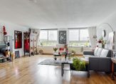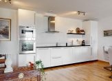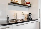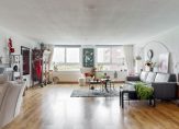 De royale woonkamer is dankzij de grote raampartijen heerlijk licht en staat in open verbinding met de neutrale open keuken. Vanuit de woonkamer heeft u toegang tot het heerlijke balkon op het westen. Vanaf het balkon kunt u genieten van prachtig zicht over water.