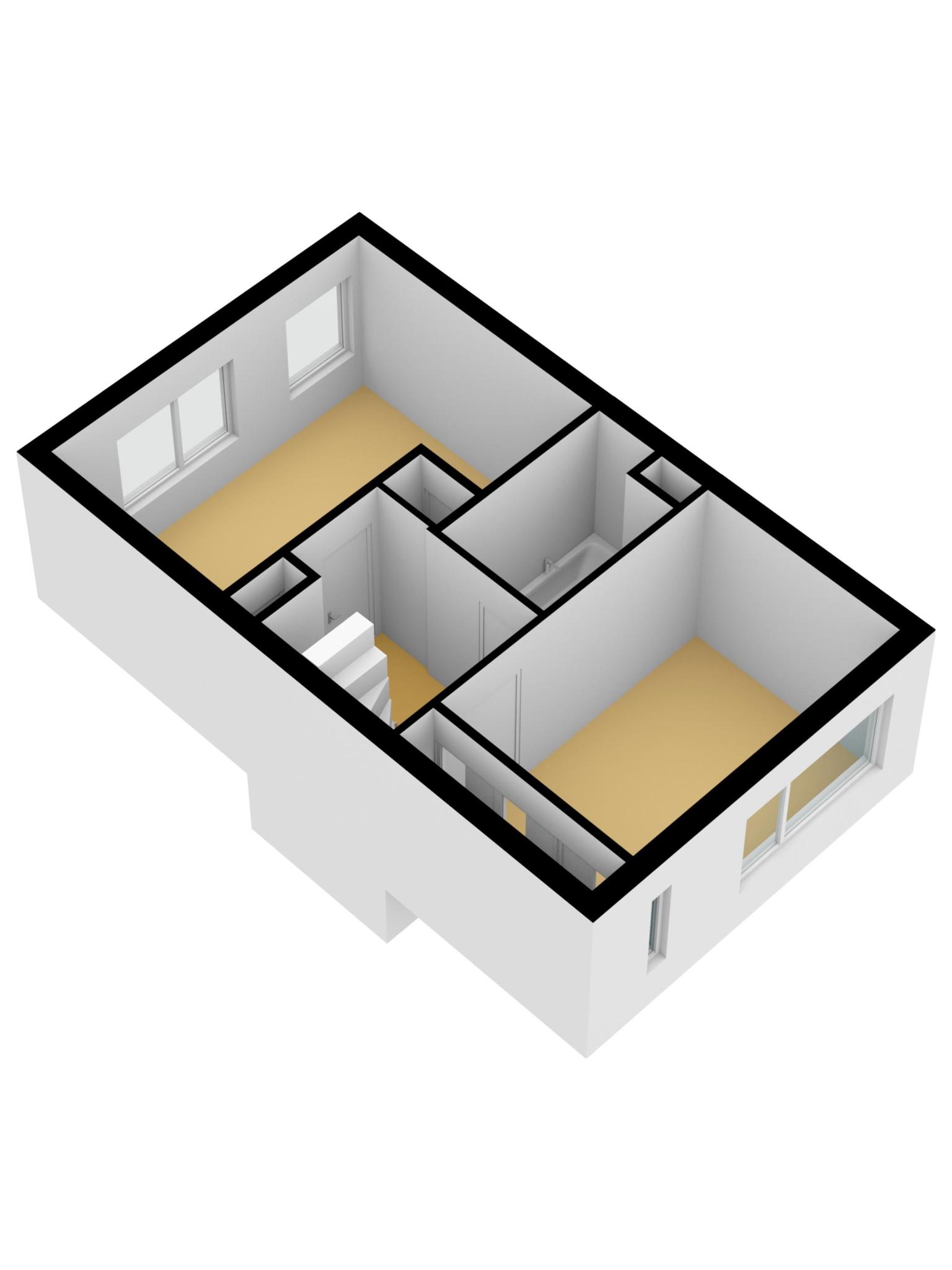 Je komt boven op de overloop en daarvandaan kun je 2 ruime slaapkamers en de badkamer bereiken. De badkamer is voorzien van een wastafel, 2e toilet en ligbad.