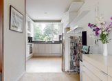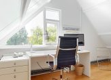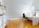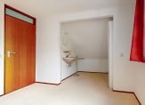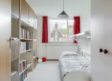 Overloop met combiketel. Op deze verdieping bevinden zich nog 2 ruime slaapkamers. De slaapkamer aan de achterzijde beschikt over veel bergruimte achter de ingebouwde schuifkasten en een aansluiting voor een extra wastafel.