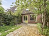 Aansluitend bevindt zich de royale achtertuin op het oosten, met stenen berging en achterom.