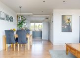 Indeling woning: ruime hal met meterkast, trapkast en modern toilet. De hal geeft tevens toegang tot de ruime en lichte woonkamer met deur naar het terras. De half open keuken bevindt zich aan de voorzijde en is de keukeninrichting voorzien van koelkast, vaatwasser, keramische kookplaat, oven en afzuigkap.